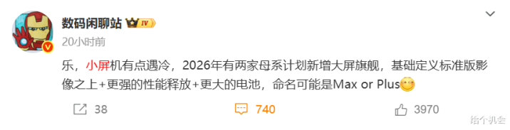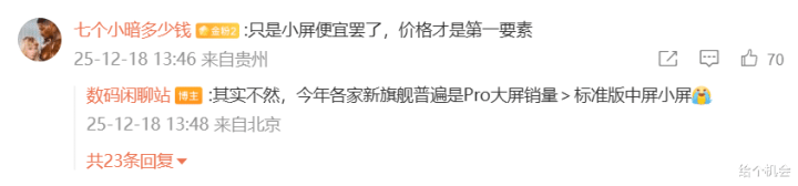 据博主数码闲聊站发文,称小屏手机有点遇冷,本年各家旗舰手机中,基本上都是pro大屏机卖的更好,圭臬版小屏或中屏的销量不如pro版大屏,下半年pro max机型还很火,抢走了小屏手机的好多份额。